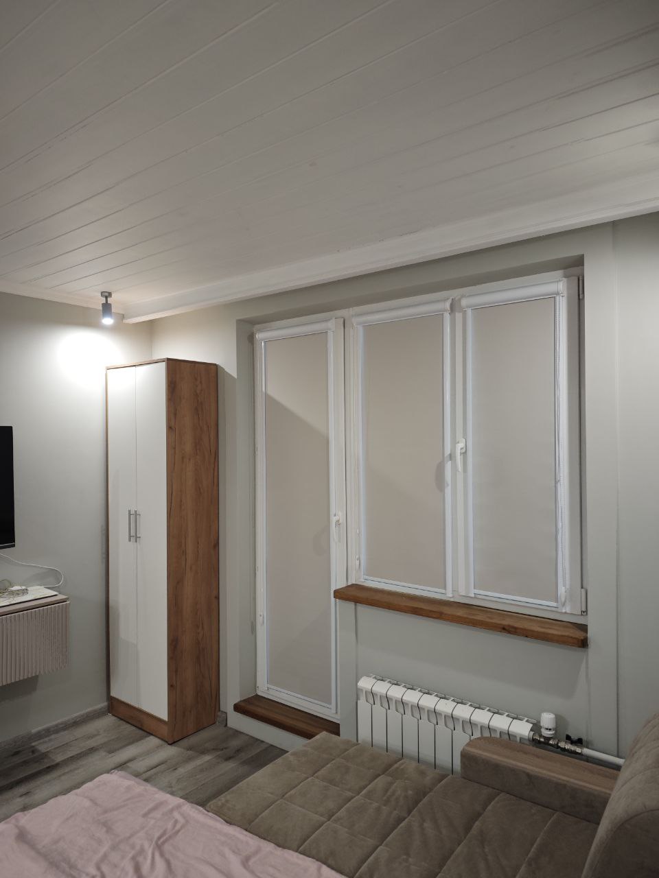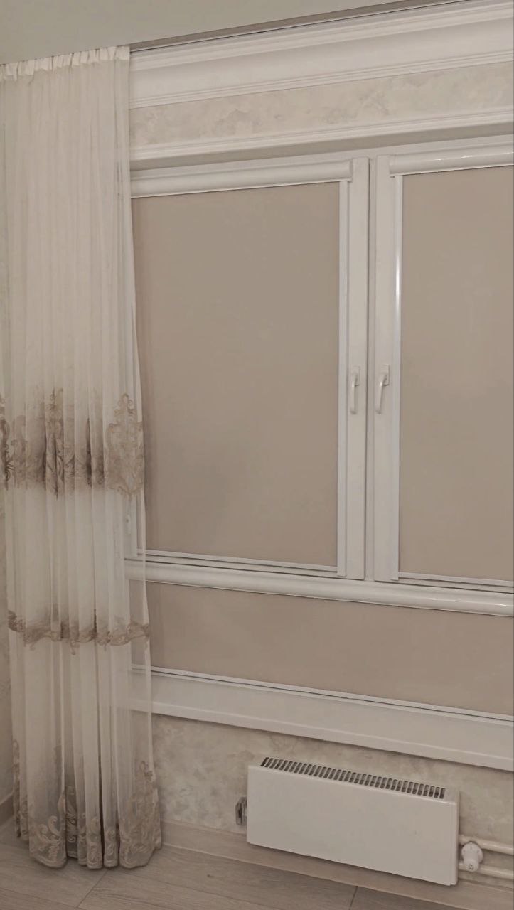 Рулонные шторы на нижней створке окон ПИК полностью рабочие и функциональные: ткань легко убирается в короб и опускается.