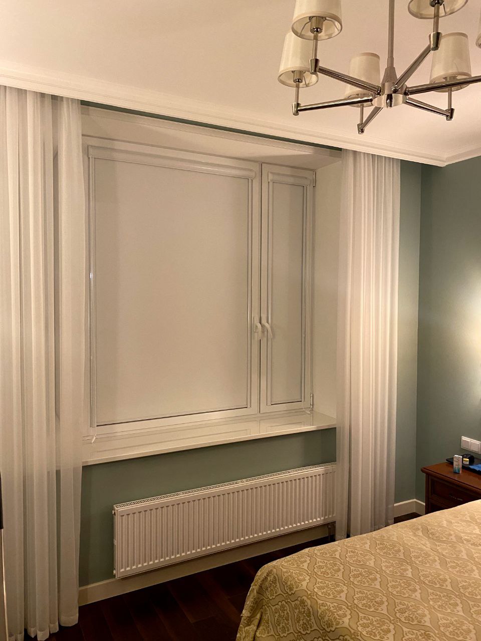 В декоративном коробе спрятаны механизмы управления, направляющие отвечают за ровный ход ткани, фиксируют ткань параллельно стеклу при открытой на проветривание форточке.