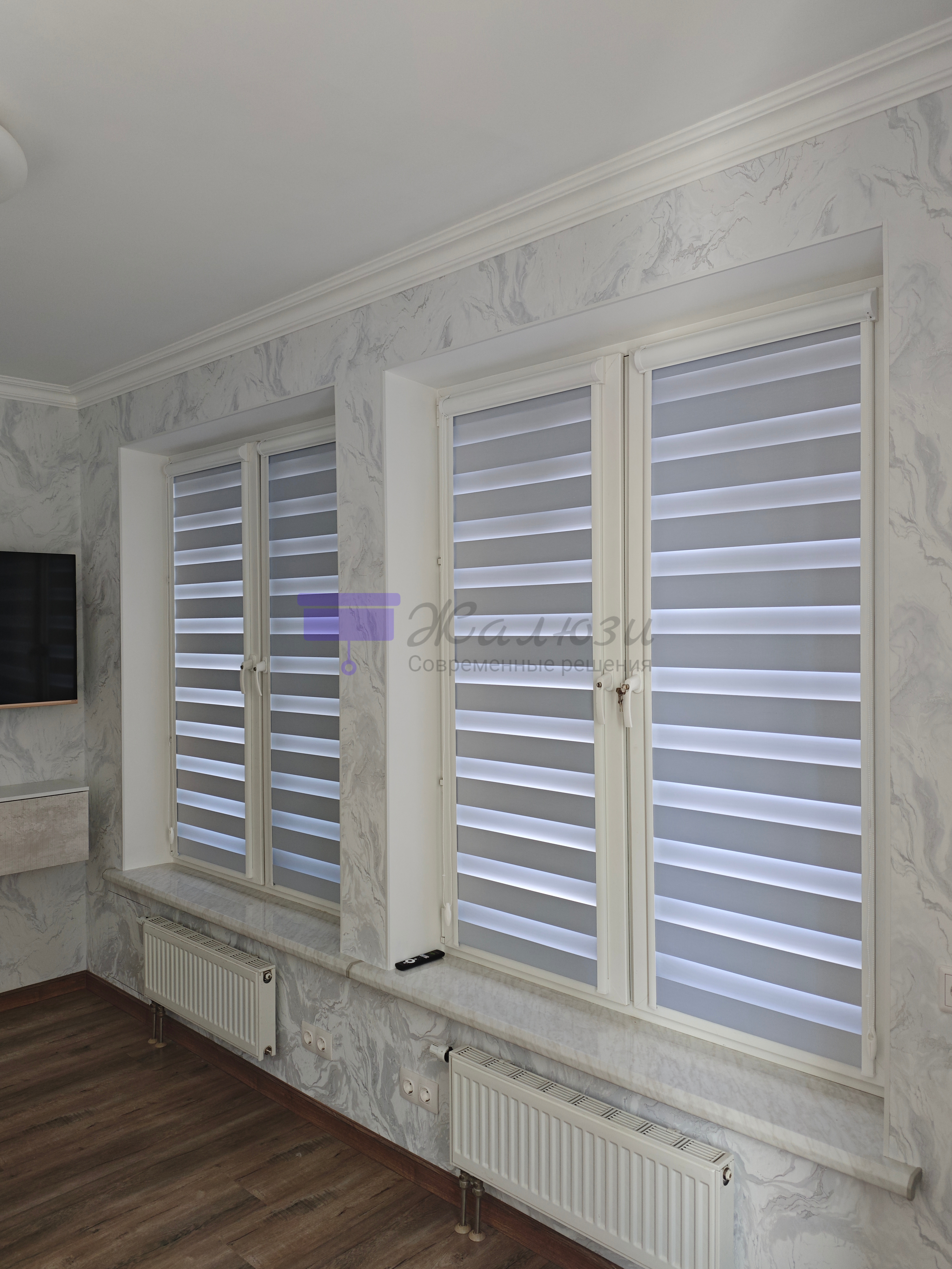 Другое название "Зебра". Главная особенность системы - это ткань шторы, которая представляет собой сочетание полос прозрачного и непрозрачного материала, используется два слоя ткани.